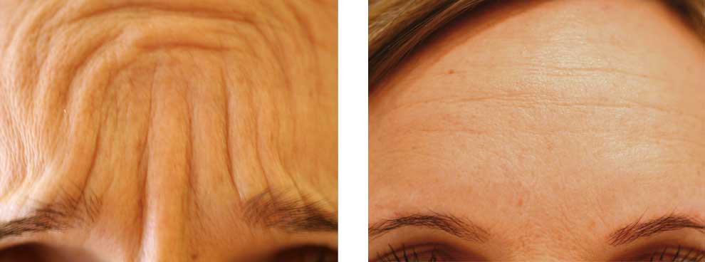 Durch gezielte Ausschaltung der Muskelaktivität lassen sich solche sehr schön glätten. Ideal sind hierfür tiefe Furchen zwischen den Augenbrauen (Zornesfalten), Falten an der Stirn oder Falten um die Augen (Krähenfüße).